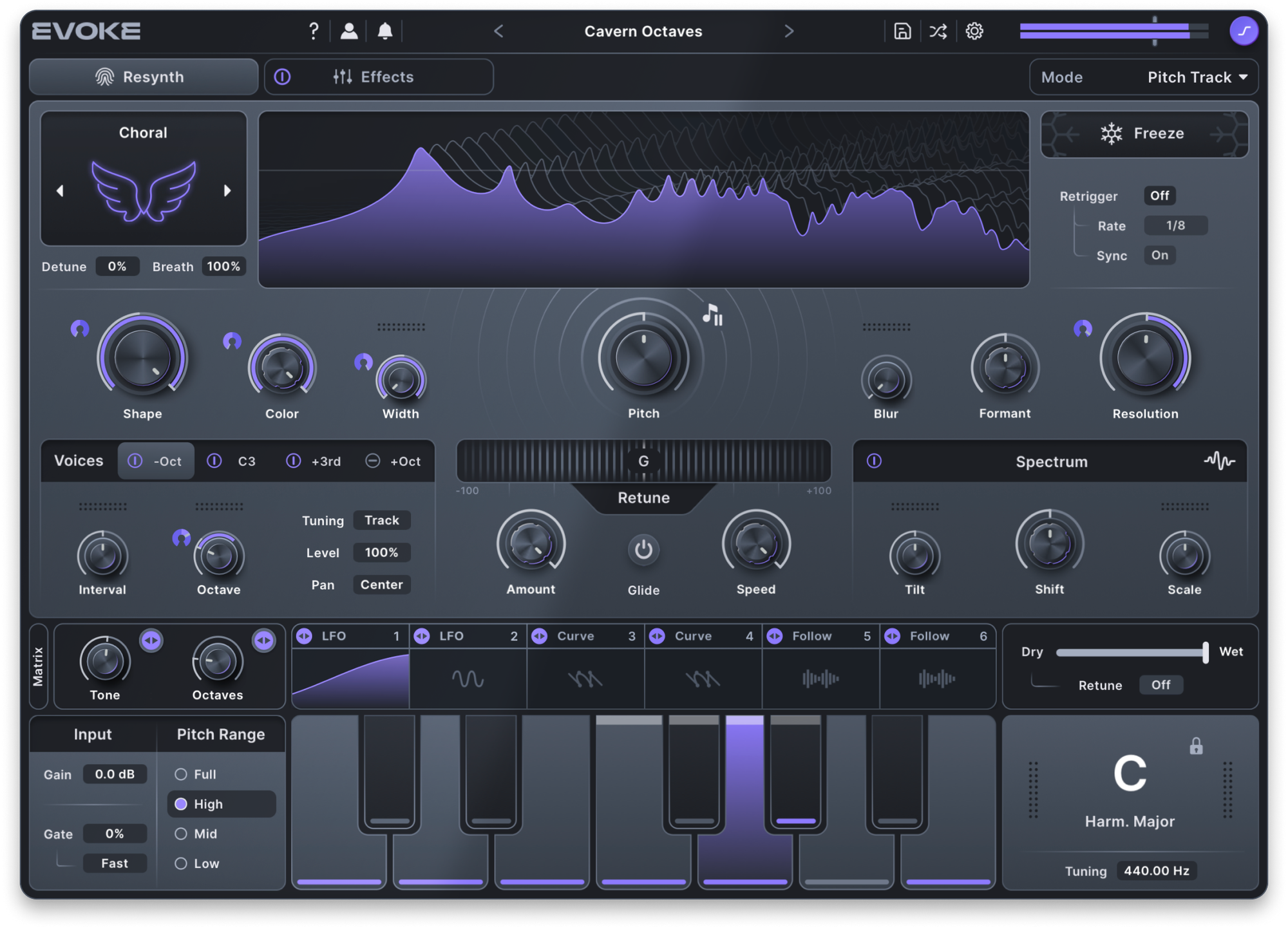 At the heart of Evoke is vocal resynthesis — a process that analyzes the incoming vocal and rebuilds it in real time using a spectral model. Instead of treating the recording as a fixed waveform, Evoke deconstructs the voice into its core elements: pitch, formants, tone, and movement. These elements are then reconstructed in a way that makes them fully flexible, giving you direct control over how the voice behaves and evolves.
