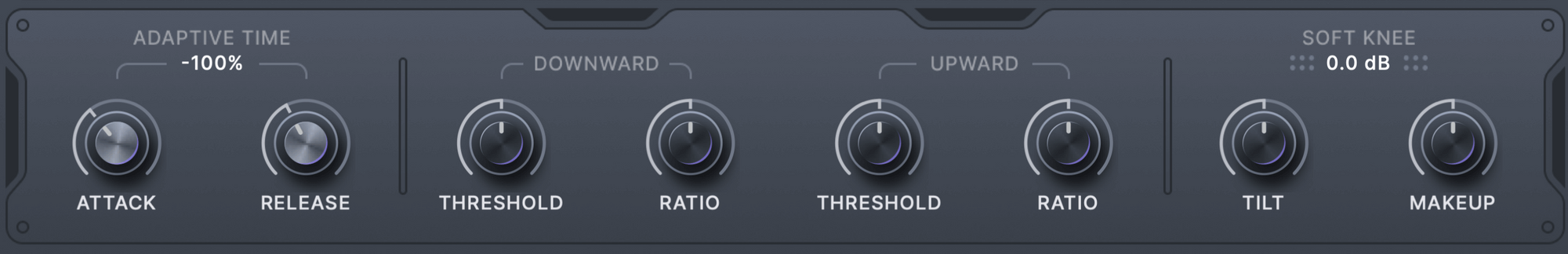 BW: Adaptive Time is another control that affects each band differently. It makes use of how faster attack and release times create less distortion with higher frequencies than with lower frequencies. The default setting of 50% is a great way to create a clean and punchy low-end while keeping the mids and highs firmly under control. You can also invert this to get interesting exaggerated effects.